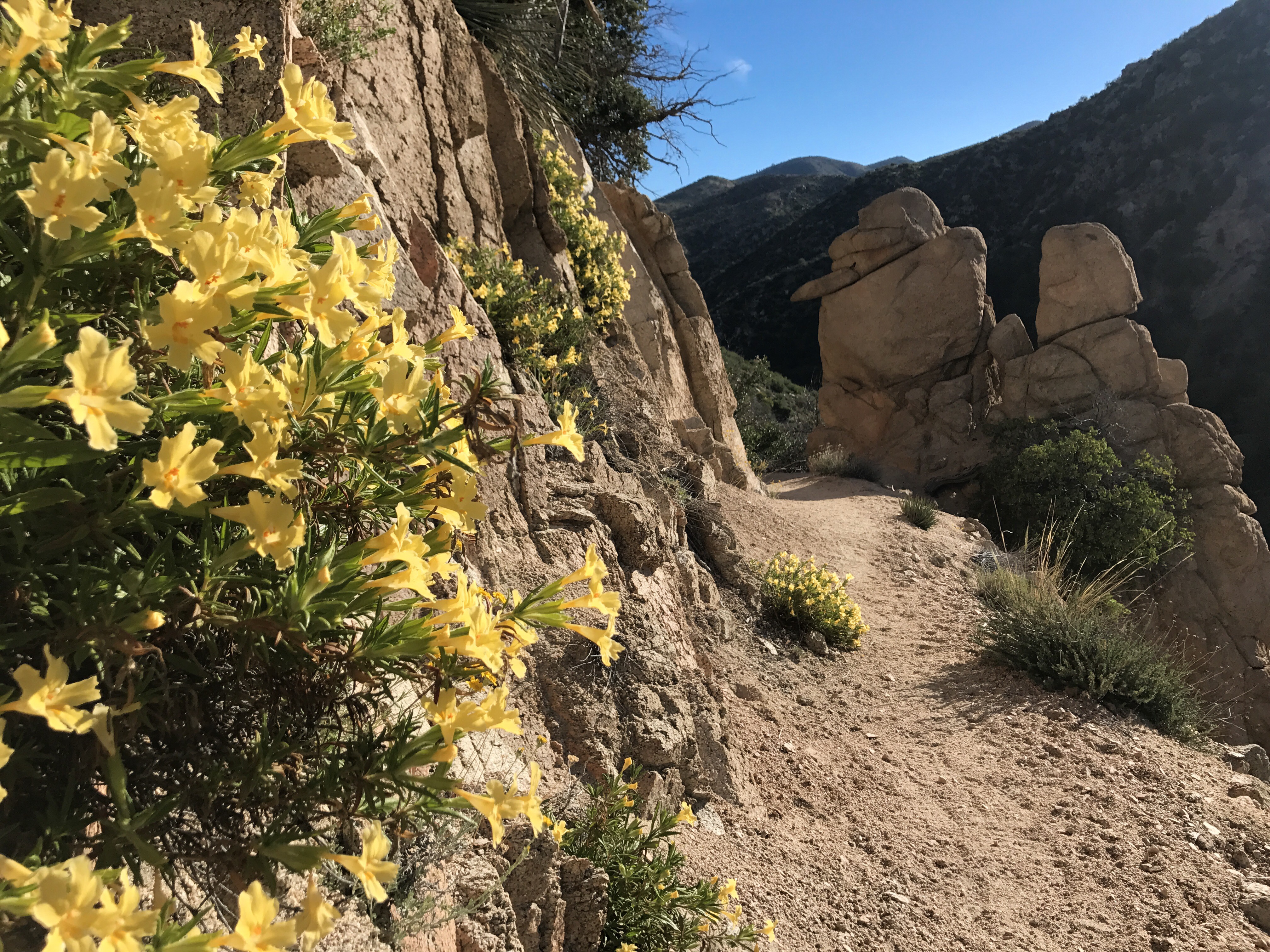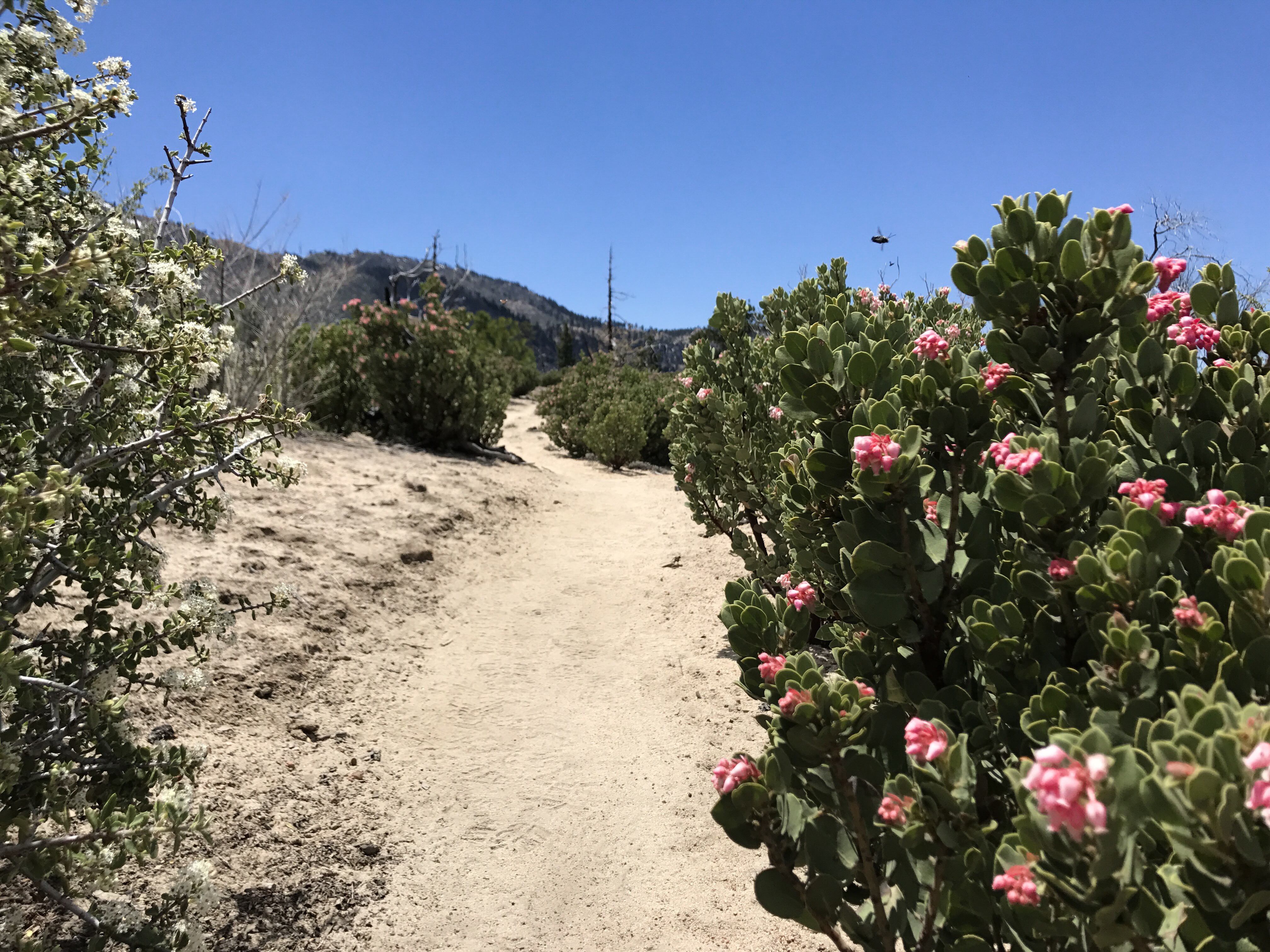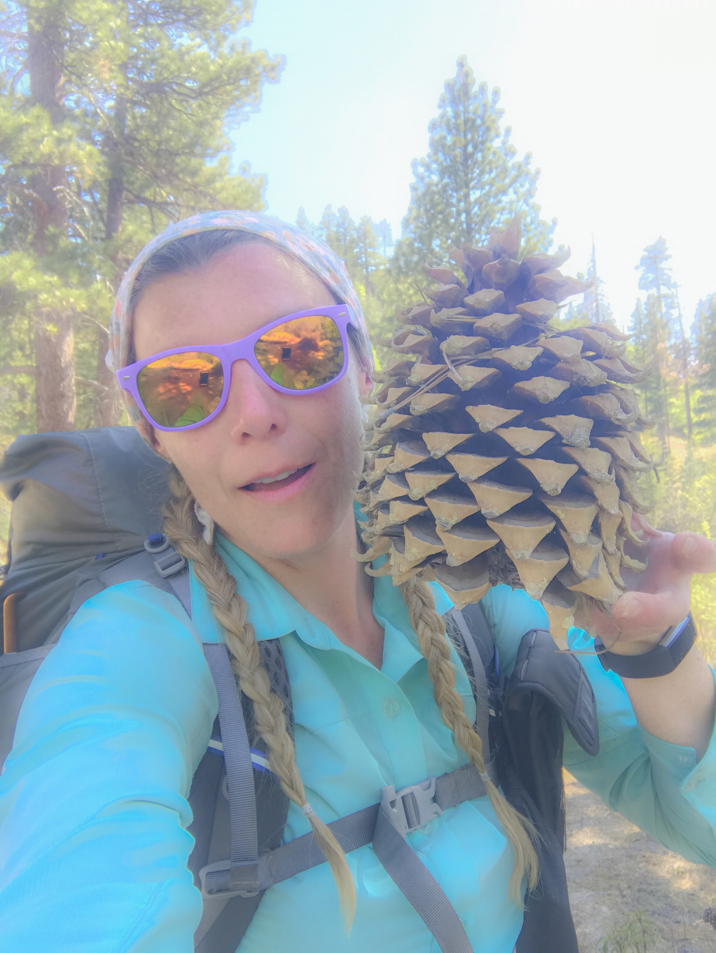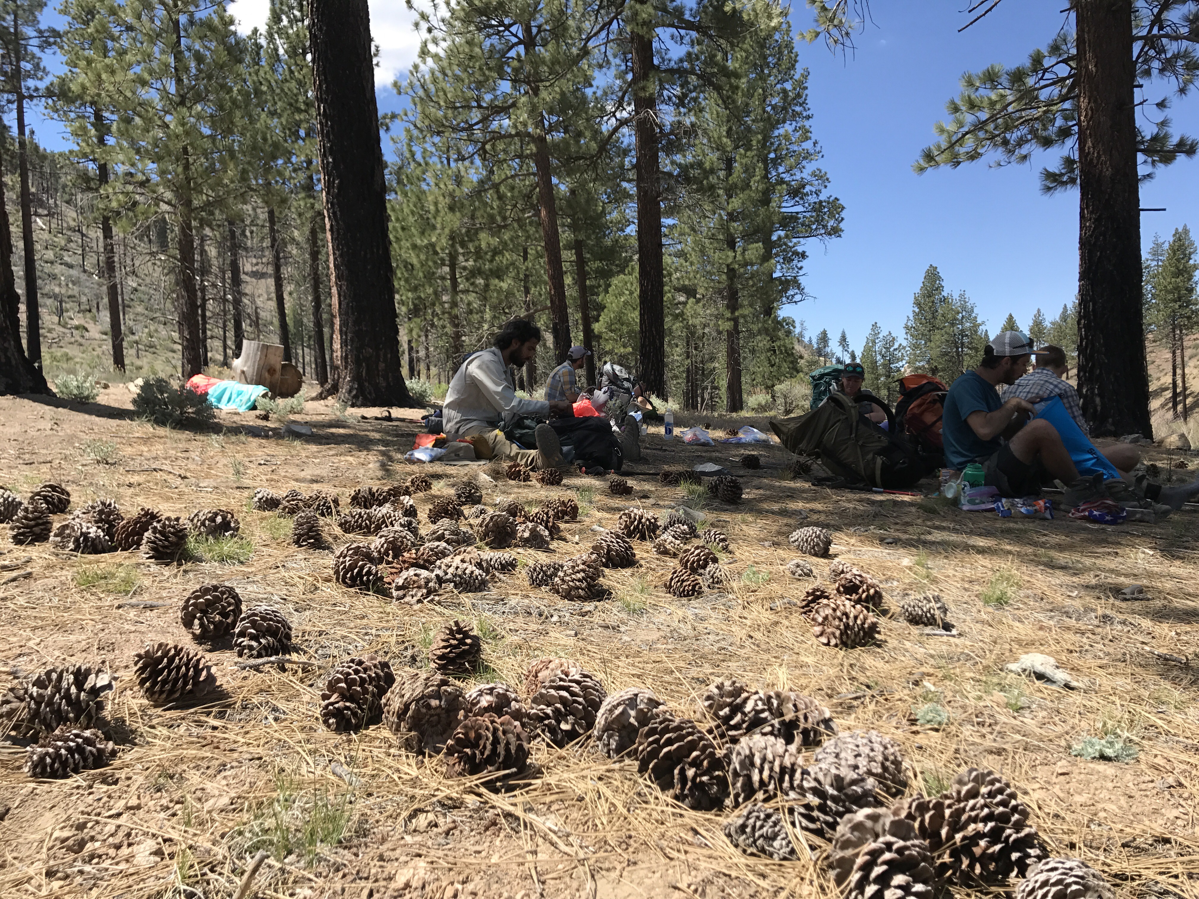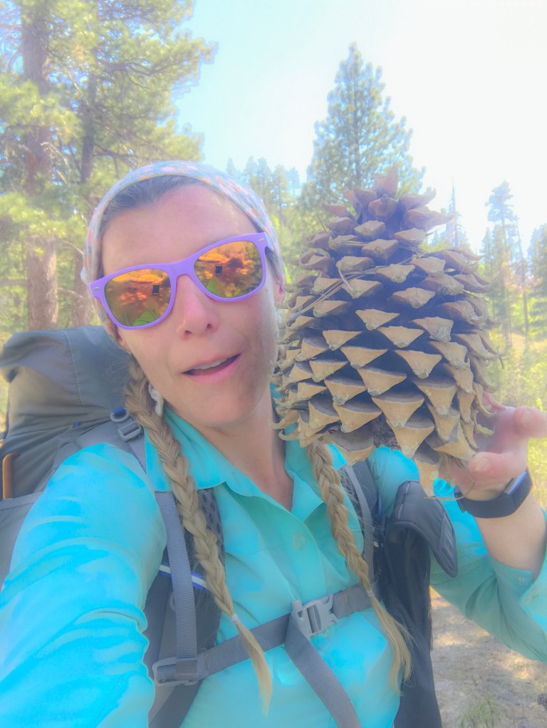 I’ll never forget the size of the pine cones from today. They call these pine cones widow-makers. The biggest pine cones I’ve ever seen! The forest scenery, soon turned into boulder fields; boulders as big as houses! The boulder fields soon turned into fields of flowering bushes; the smell of their sweet flowers filled the air.