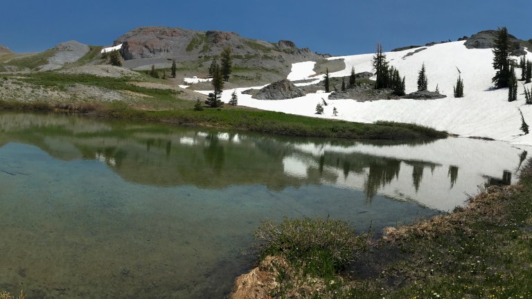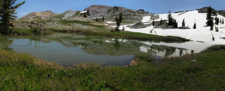 A beautiful large lake sat in the middle of this bowl. As I explored the area a bit more, I discovered a smaller lake, which looked as if it were only in existence because of the snow melt, and didn’t have a name on the map. It was an emerald green color, surrounded by wild flowers and snow capped mountains.